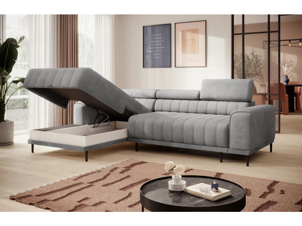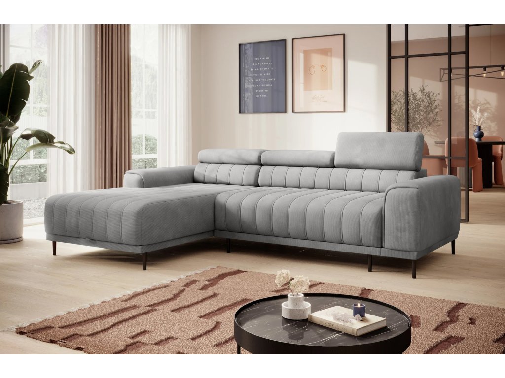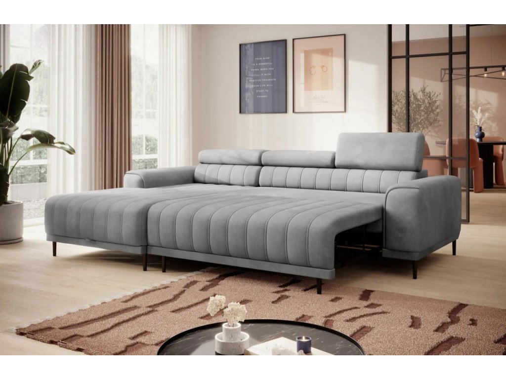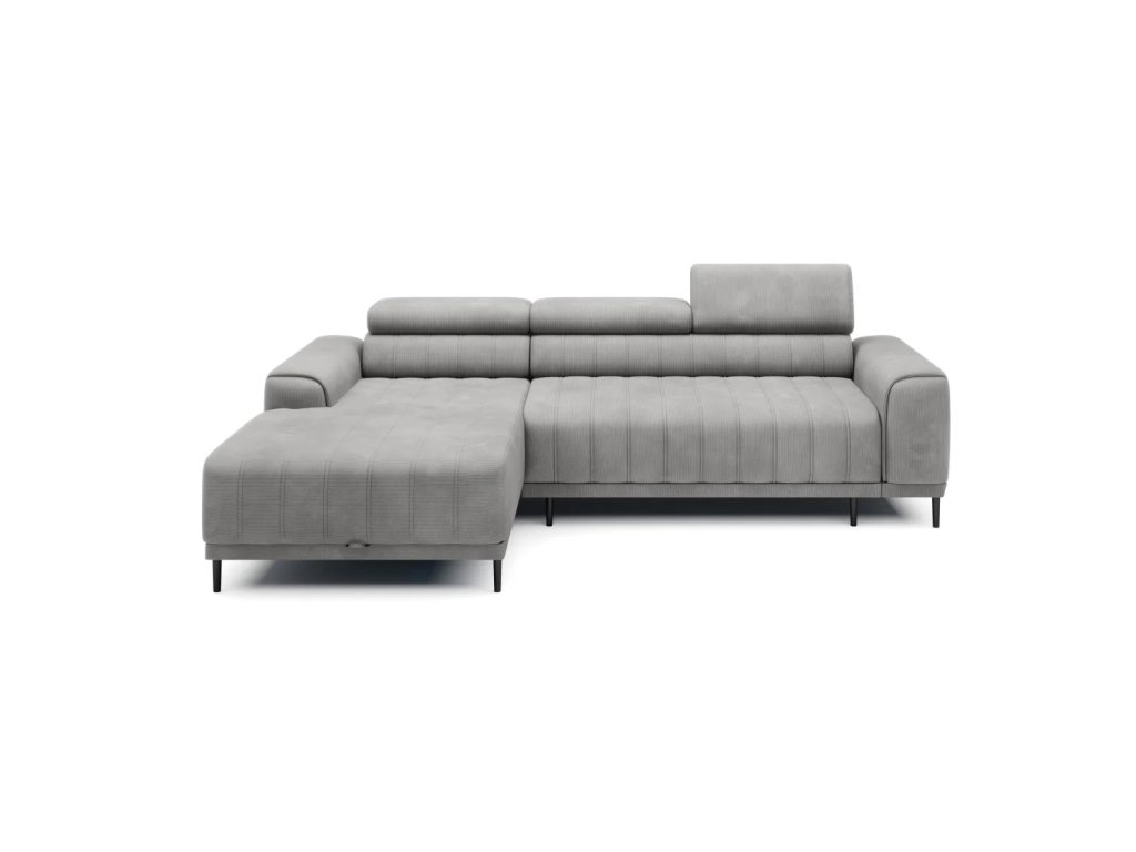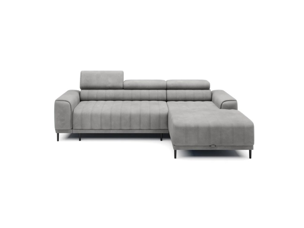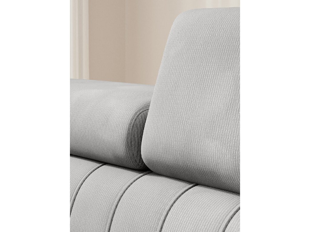 CALDO rohová sedačka vyznačujúca sa zvislým prešívaním. Nastaviteľné opierky hlavy umožňujú prispôsobiť relaxáciu individuálnym potrebám užívateľa. Vďaka rozkladaciemu systému PUMA sa z tejto rohovej sedačky ľahko stane posteľ s plochou na spanie 215 × 136 cm. Nádoba na posteľnú bielizeň ukrytá pod otomanom vám umožní uložiť prikrývky a vankúše.