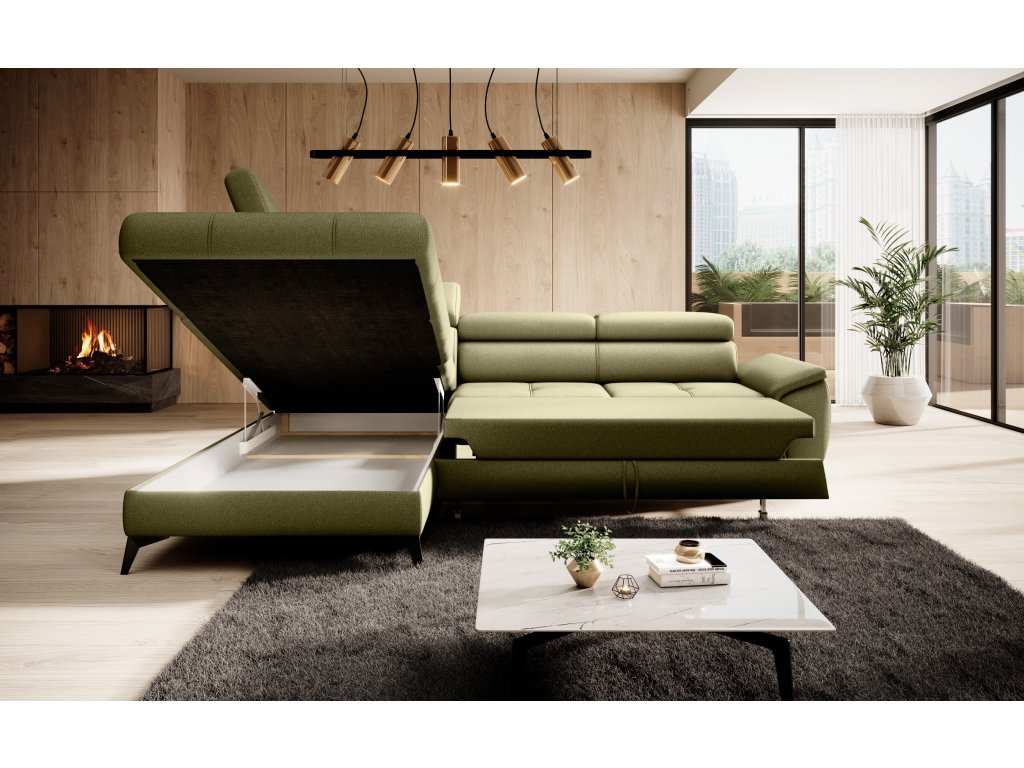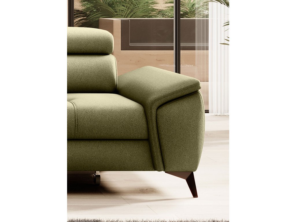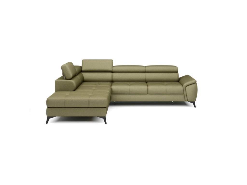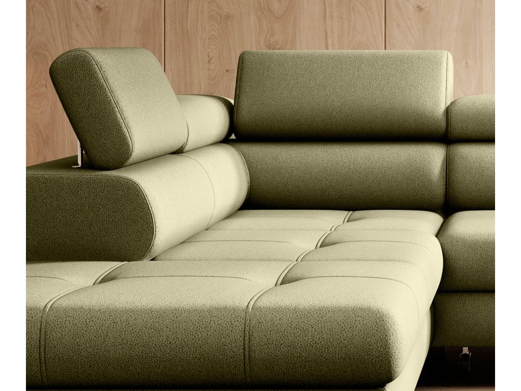 Je to elegantná a funkčná rohová sedačka, ktorá je dokonalým doplnkom každej obývačky. Jeho rovná línia a jemné prešívanie robia nábytok mimoriadne pôsobivým. Tento model je vybavený pohyblivými opierkami hlavy, ktoré zaisťujú pohodlné používanie nábytku. Rozkladací systém DELFIN umožňuje premeniť kút na útulné miesto na spanie a prítomnosť kontajnera poskytuje ďalší úložný priestor.